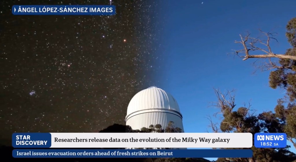 Very happy to see my images and time-lapses videos taken at Siding Spring Observatory in the ABC News segment about the GALAH DR4 (Data Release 4) that was broadcasted in Australia national TV on Wednesday 2nd October 2024. Funny enough, this week I’m attending the Conference for the 50th Anniversary of the Anglo-Australian Telescope (AAT) at Siding Spring Observatory (Coonabarabran), where I gave an invited talk about my research with KOALA+AAOmega, although at that particular time I was attending an online meeting about the exciting BlueMUSE instrument.