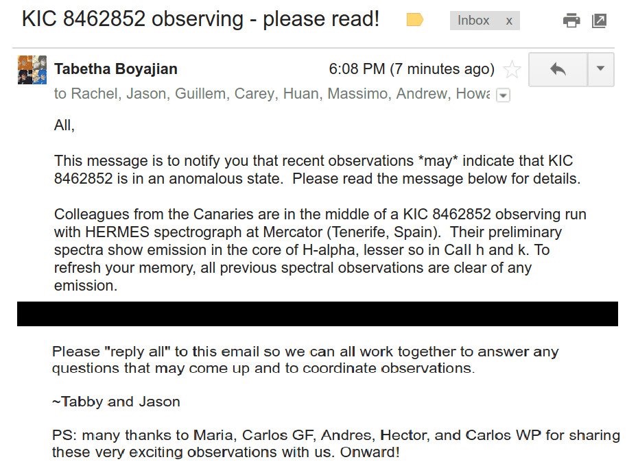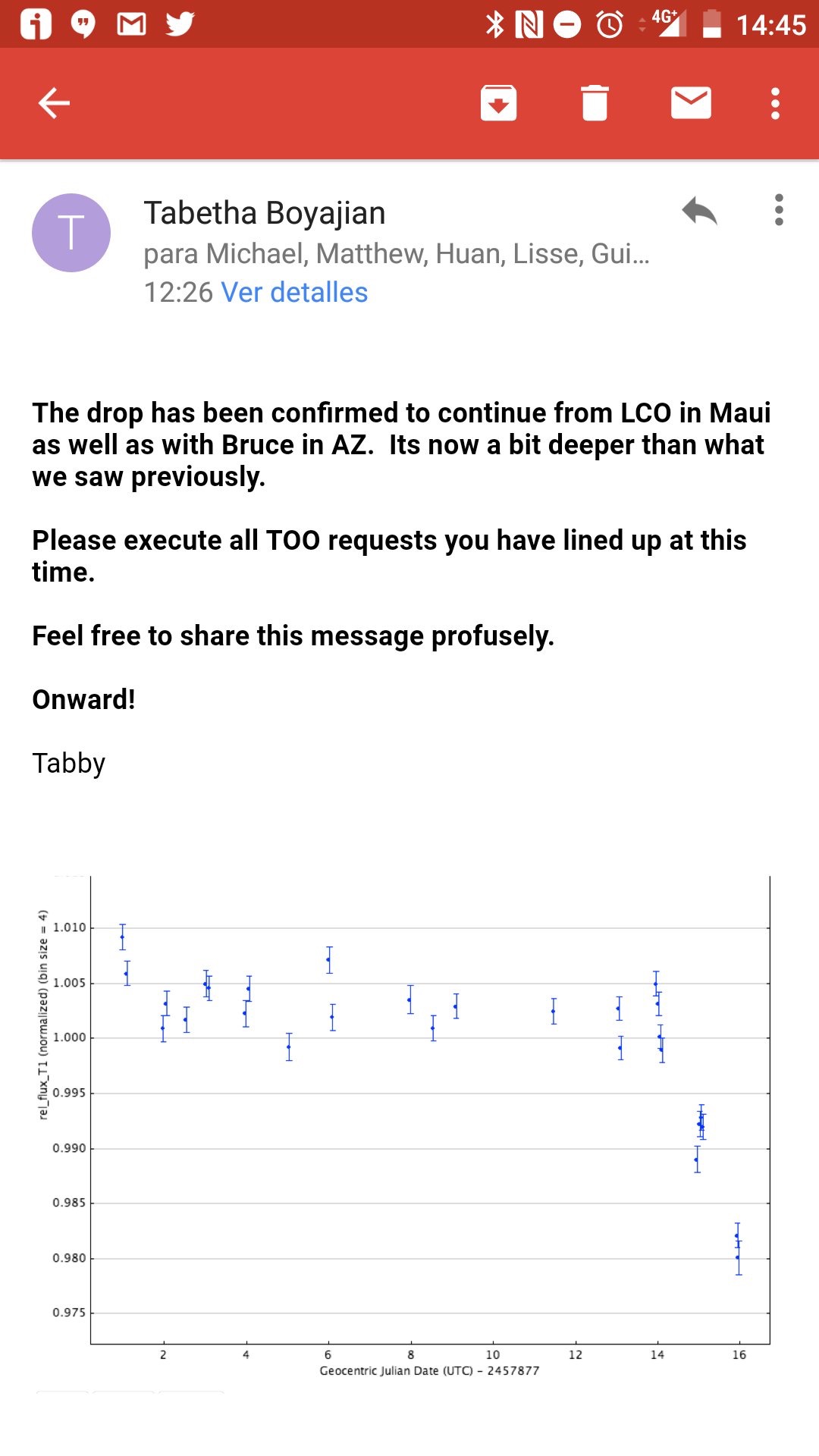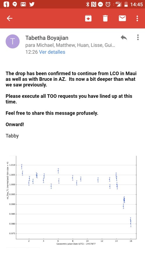 On Sunday night, observations were already showing “something weird” happening again in Tabby’s star. These features were detected by spectroscopy, no photometry. They contacted the very same Tabetha S. Boyajian (Tabby), the initial study’s lead author, who is leading an international follow-up of the star. She sent this message to her collaborators alerting of the weird behavior in Tabby’s star: