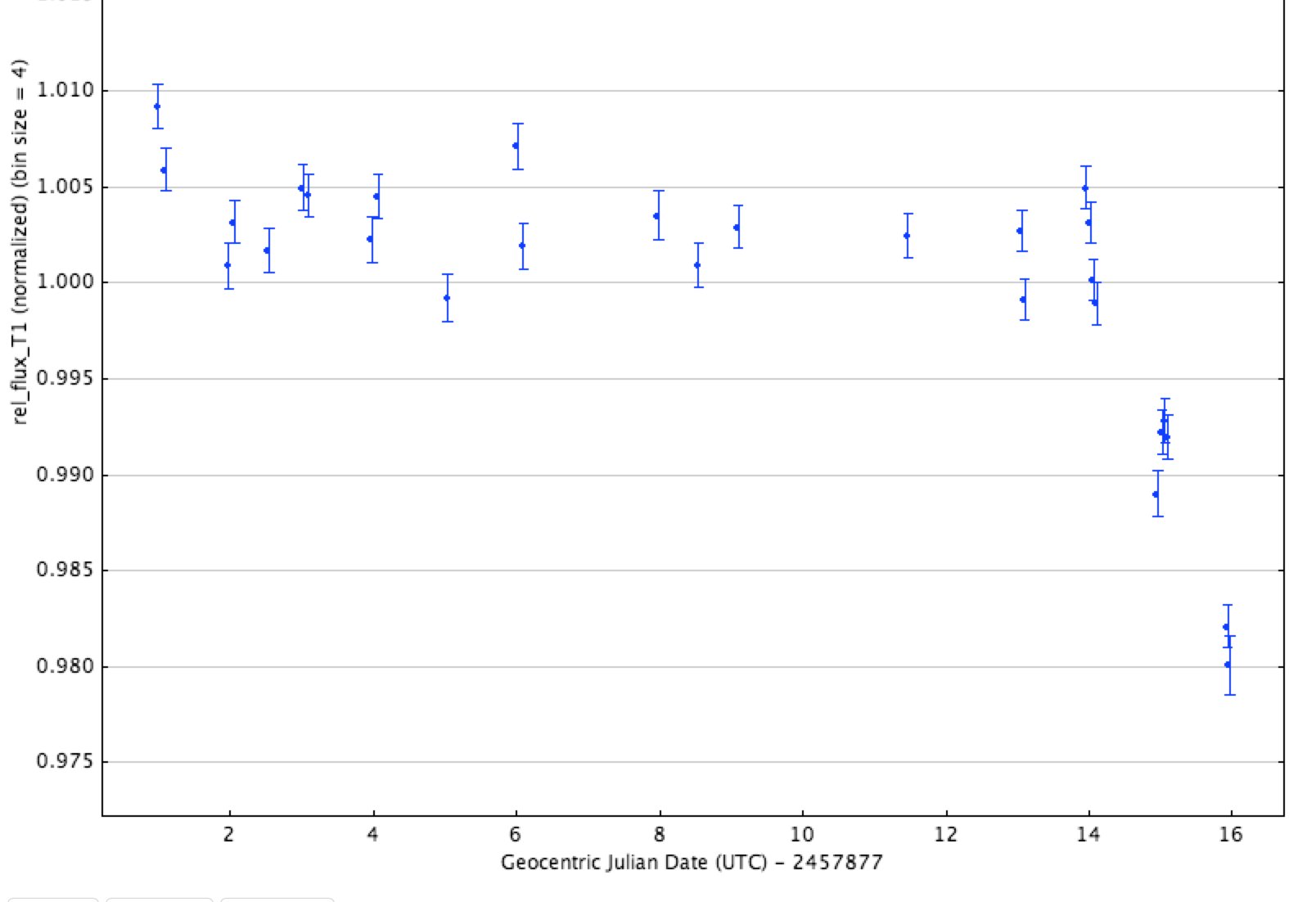 This LCOGT plot shows the brightness of Tabby’s star relative to the star’s normal brightness: the lowest point shows a 2% drop! Tabetha S. Boyajian (Tabby) triggered the alert: