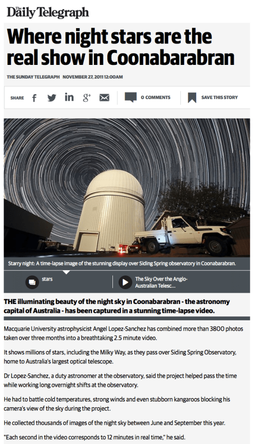 Interview at The Sunday Telegraph (Sydney), 27 November 2011, “Where night stars are the real show in Coonabarabran”.