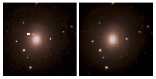 Composite of detection images, including the discovery z image taken on August 18th and the g and r images taken 1 day later. Right: The same area two weeks later. Credit: Soares-Santos et al. and DES Collaboration.