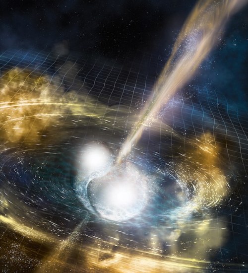 Artist’s illustration of two merging neutron stars. The narrow beams represent the gamma-ray burst while the rippling space-time grid indicates the gravitational waves that characterize the merger. Swirling clouds of material ejected from the merging stars are a possible source of the light that was seen at lower energies. Credit: National Science Foundation/LIGO/Sonoma State University/A. Simonnet.