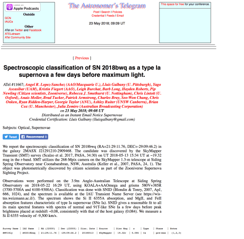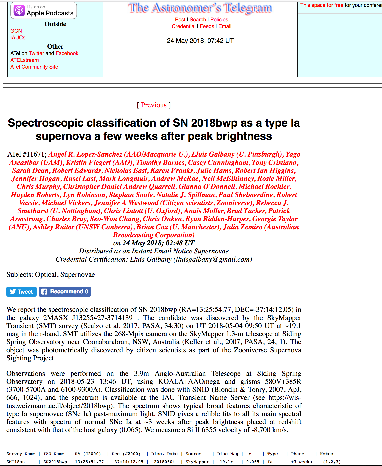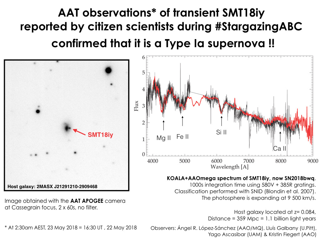 4. But the most important contribution for the show was actually observing with the AAT two transients reported by the citizen scientists who participated in a program to search for type Ia supernova in other galaxies. After confirming that the transient was there, we got spectroscopic information using KOALA+AAOmega, reduced the data, analysed the data, confirmed that both transients were type Ia supernova in distant galaxies, and wrote a science report with the discovery!