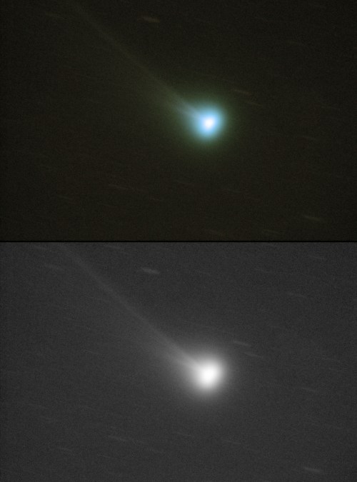My vision of the comet Lemmon 2012 F6 from Sydney on Tuesday 19th February 2012, at 21:20 AEST (10:20 UT). I combined 7 frames of 6 seconds exposure each (42 seconds total exposition time), at 1600 ISO using Skywatcher Black Diamond Telescope D = 80 mm, f = 600 mm and my CANON EOS 600D at primary focus. Note the faint tail moving towards the upper-left. Credit: Angel R. López-Sánchez.