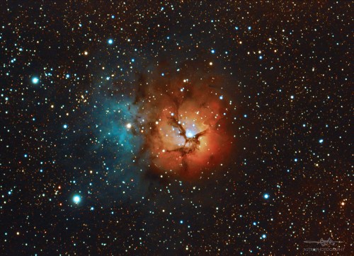 Updated version of my test image of the Lagoon Nebula (M8) with the first light of the ZWO ASI1600MM Pro camera and broad-band filters.